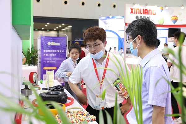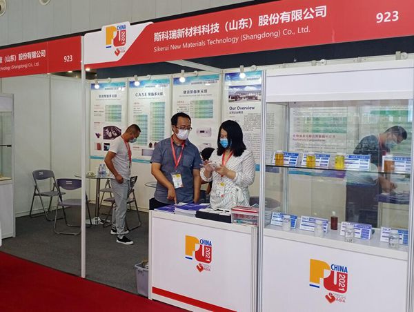 走到淄博华天橡塑科技有限公司展台,各种颜色的聚氨酯弹性体产品琳琅满目。“我们这次带来了TPU、CPU、聚酯多元醇、铺装系列多种新产品。目前公司在国内率先研发的产品已经超过200个,涵盖CPU、TPU、塑胶铺装材料、聚酯多元醇等系列,供应国内外3000多家客户,多个单项产品还是国内首次研发并投放市场。”华天公司副总经理田亮介绍说。